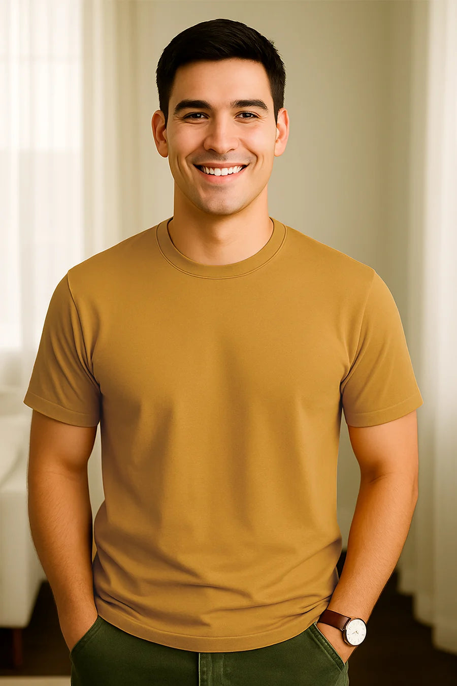 Solid Mustard Round Neck Short Sleeved Plain Men's T-shirt